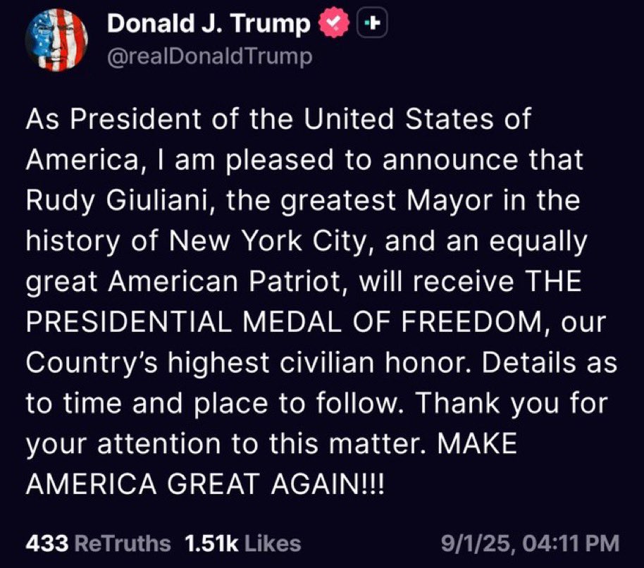 President Trump has announced he will bestow the Presidential Medal of Honor on Rudy Giuliani, calling him “the man who cleaned up NYC and fought back against the 2020 ‘steal.’” The announcement was made on TruthSocial, citing Giuliani’s “five lifetimes of service.”